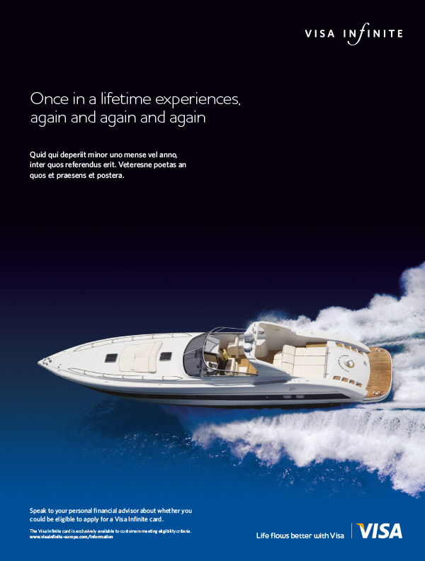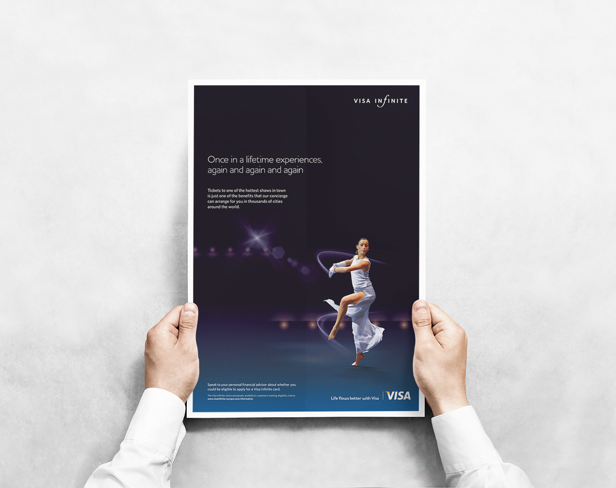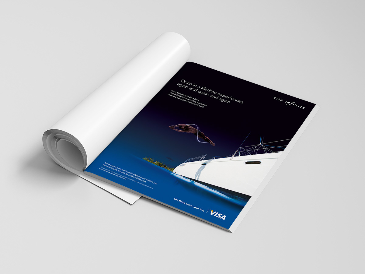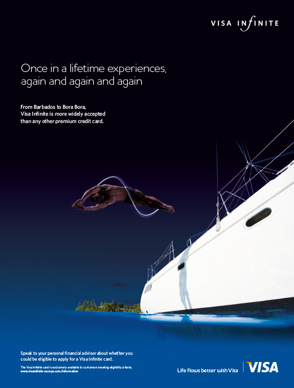 Problem: Create a premium, aspirational global advertising campaign to appeal to prospective Visa Infinite cardholders, a brief Visa Europe's preferred Advertising agency had struggled with. Solution: Concept through to final artworking including copywriting, photo manipulation and retouching combine to deliver a sensitive campaign communicating the key cardholder benefits through a series of print and digital advertisements using the oxymoron ‘Once in a lifetime experiences, again and again and again’. Outcome: “I always thought that I needed to use a large agency for this kind of campaign. I couldn’t have been more wrong. Why didn’t I come to you in the first place?” Tamara Bates, Senior Marketing Communications Manager, Visa Europe