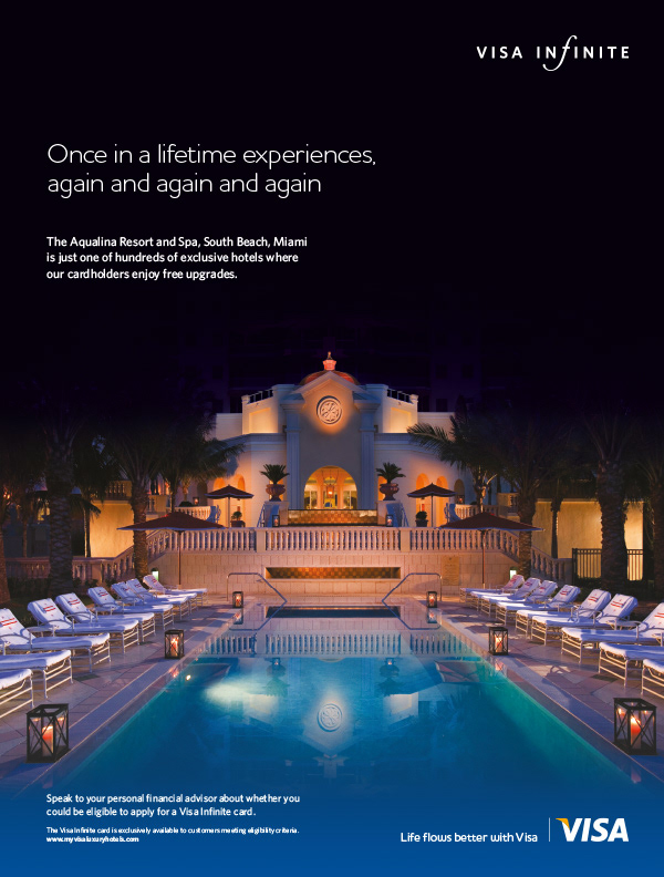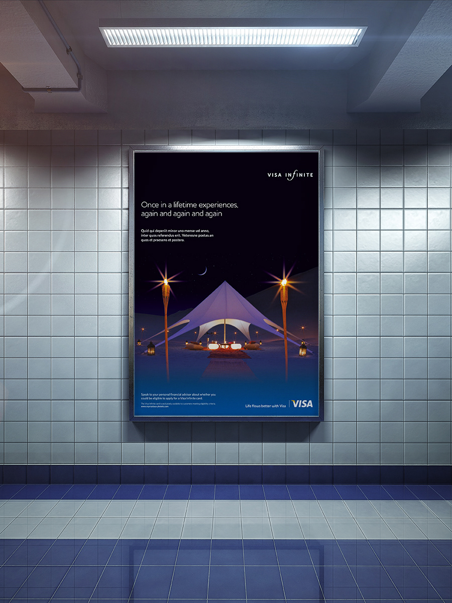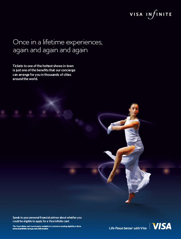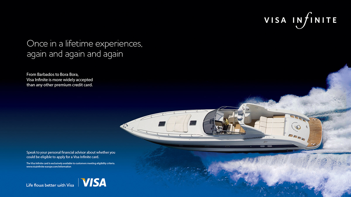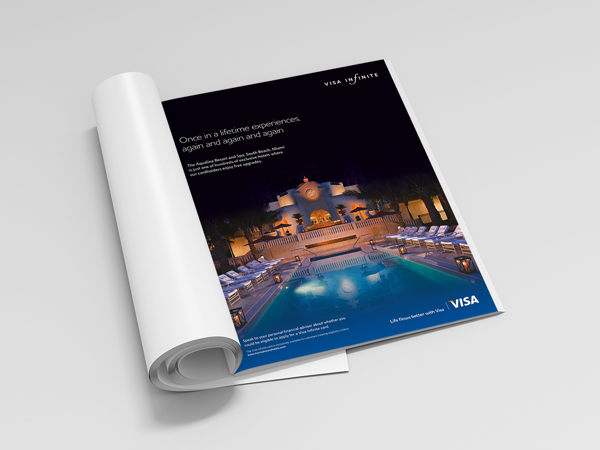 Problem: Create a premium, aspirational global advertising campaign to appeal to prospective Visa Infinite cardholders, a brief Visa Europe's preferred Advertising agency had struggled with. Solution: Concept through to final artworking including copywriting, photo manipulation and retouching combine to deliver a sensitive campaign communicating the key cardholder benefits through a series of print and digital advertisements using the oxymoron ‘Once in a lifetime experiences, again and again and again’. Outcome: “I always thought that I needed to use a large agency for this kind of campaign. I couldn’t have been more wrong. Why didn’t I come to you in the first place?” Tamara Bates, Senior Marketing Communications Manager, Visa Europe
